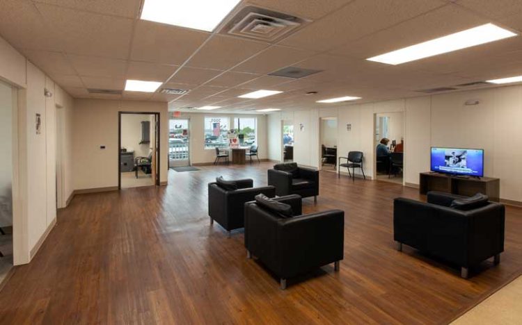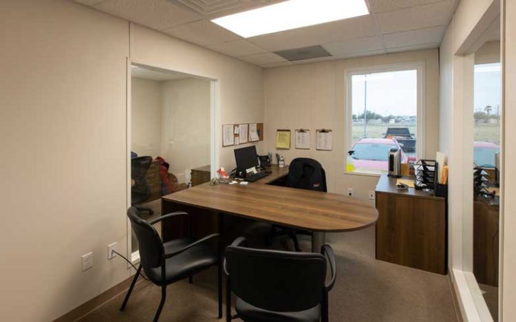 When Weslaco, Texas-based Payne Automotive Group wanted to expand their preowned dealership division into multiple South Texas locations, they turned to Ramtech to construct permanent facilities that would quickly accommodate their operations. The facilities feature seven offices around the perimeter of the building with 4’0 x 6’0 windows for easy viewing between rooms, a large customer waiting and reception area, and an employee breakroom. The exteriors feature a parapet wall design with a combination of HardiePanel and 26-gauge high-rib steel R-Panel siding. The interiors are finished with VCG on the walls and Allure resilient laminate wood plank flooring. Heating and cooling are accommodated with a split system at one location and wall-mounted package units at the other.